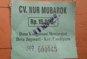 Lumajang Wartapos.id – Persoalan hilirmudik kendaraan Truk Pasir di Desa Jugosari Kecamatan Candipuro Lumajang Jawa Timur yang sempat memanas beberapa waktu lalu dan sempat ditutup oleh warga sekitar, kini mulai mencair, kompensasi kepada warga sebesar Rp 15000 per truk kini sudah diberlakukan, setiap truk yang lewat di Jugosari harus membayar kompensasi tersebut dan diberi karcis, namun hal itu diprotes oleh salah seorang pengusaha tambang kepada Kepala Desa Jugosari karena dalam karcis tersebut tertera nama CV yang bersangkutan.