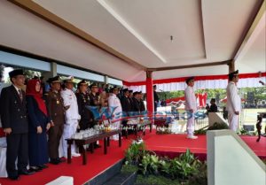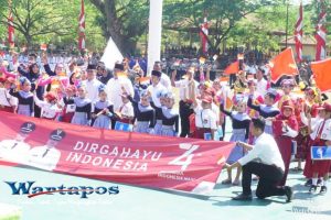 Bangkalan, Wartapos.id – Peringatan detik-detik Proklamasi dan pengibaran Bendera Merah Putih yang dipusatkan di alun-alun selatan, Jalan Veteran, Bangkalan pada Sabtu (17/08/2019) tersebut dilaksanakan dengan semarak dan khidmat. Sebelum dimulainya peringatan detik-detik Proklamasi, Sanggar tari TARARA menyuguhkan Drama Kolosal dan tari Tradisional yang mengusung tema perjuangan dan pendidikan. Tema tersebut sesuai dengan tema peringatan HUT RI ke 74 yakni “SDM Unggul, Indonesia Maju.”