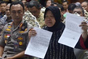 Tri Rismaharini Wali Kota Surabaya bersama Kapolrestabes, Kombes Pol Sandi Nugroho saat jumpa pers, Rabu (4/02/2020) di kediaman Wali Kota sembari menunjukan surat permohonan maaf dari pemilik akun facebook Zikria Dzatil