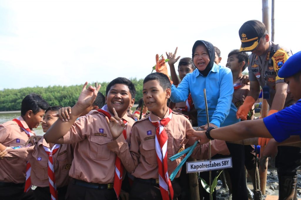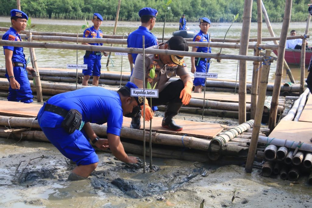 Dibawah komando Wakapolda Jawa Timur Brigjen Pol Djamaludin Personil Polri, TNI, Mahasiswa serta Siswa Sekolah Dasar bahu membahu menanam pohon Bakau dan pelepasan benih kepiting di kawasan