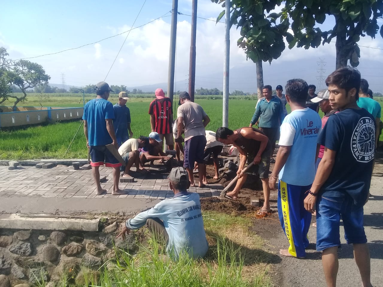 Warga bergotong royong memasangan paving block pun terlihat dengan penuh rasa gembira dan suka cita. Pemasangan paving block itu luasnya kurang lebih 60meter dengan panjang 30 meter dan lebar 2 meter.
