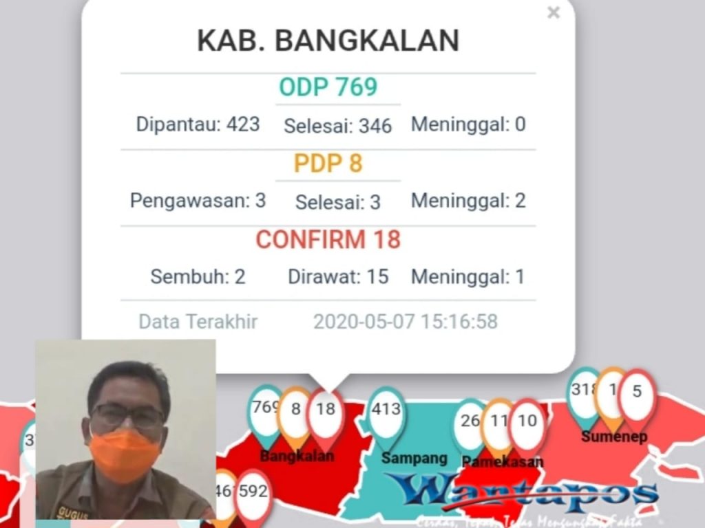 Terkonfirmasi Positif Covid-19 sebanyak 18 Orang pada Kamis (07/05/2020), Humas Gugus Tugas Covid-19 Kabupaten Bangkalan mengeluarkan keterangan pers. Dalam keterangan persnya, Humas Gugus Tugas Percepatan Penanggulangan Covid-19, Dr. Agus Zein, S.Pd, M.Pd menjelaskan penambahan pasien yang terkonfirmasi berdasarkan data dari Dinas Kesehatan Kabupaten Bangkalan.