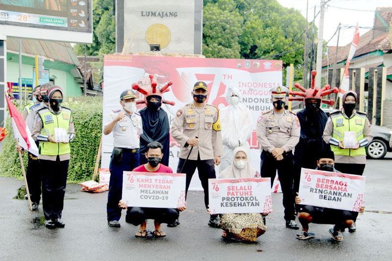 Selain itu, dalam kegiatan tersebut Satlantas Polres Lumajang menggelar Drama Teatrikal merah putih lawan covid dengan menampilkan 1 orang berperan sebagai pocong dan 2 orang sebagai virus corona.