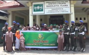 Hadir dalam agenda bakti sosial ini, jajaran anggota Subdenpom V/3-1 Probolinggo serta pengurus yayasan Nahdlatul Ulama. Dalam kesempatan tersebut diserahkan sejumlah paket bantuan berupa Beras 50 Kg, Mie instan 5 kardus, Telur satu krat, Gula 7 Kg serta pemberian dana (uang) pada anak yatim dari ibu-ibu Persit Subdenpom yang diserahkan secara simbolis pada perwakilan anak yatim.