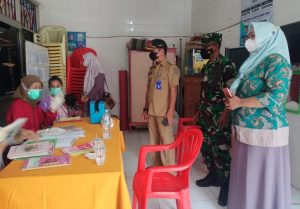 Dalam pelaksanaan kegiatan vaksin ini diawali dari tahap pelaksanaan registrasi, screning, vaksinasi hingga observasi.” ujar Danramil saat meninjau pelaksanaan Vaksinasi.