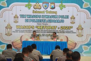 Sidoarjo, Wartapos.id – Dalam rangka.meninjau, kegiatan kesiapan,dan pelaksanaannya Operasi Ketupat Semeru 2023, Tim Wasops Itwasum Polri dipimpin Brigjen Pol. Sjamsul Sidiq melakukan kunjungan langsung, sekaligus ingin menengar masukkan, juga memaparkan tindak lanjutnya di Polresta Sidoarjo, Selasa (25/4/2023).