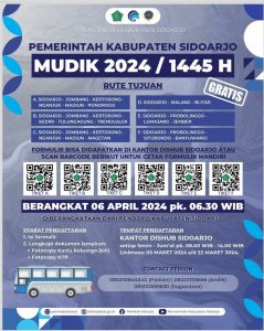 “Mudik gratis ini syaratnya cukup simple, yaitu hanya mengisi formulir yang bisa diambil ke kantor Dishub atau unduh dari qrcode, fotocopy Kartu Keluarga, dan fotocopy KTP, kemudian diserahkan langsung ke Dinas Perhubungan Kabupaten Sidoarjo,” jelasnya.
