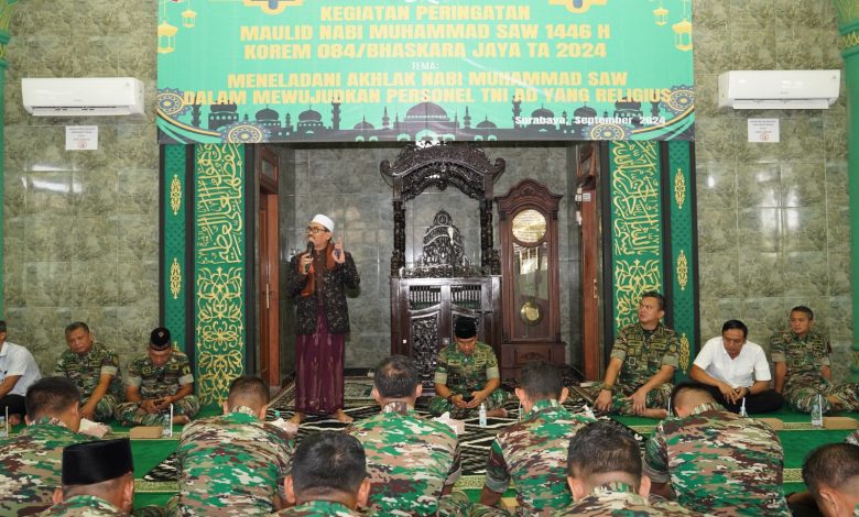 Surabaya, Wartapos.id— Korem 084/BJ menggelar peringatan Maulid Nabi Muhamad SAW 1446 H / 2024 M digelar di Masjid Al-Wathon Jalan A. Yani No. 1 Surabaya pada hari Jum’at (27/9/2024). Acara tersebut dihadiri oleh Danrem 084/Bhaskara Jaya Brigjen TNI Danny Alkadrie, para Kasi Kasrem 084/BJ, Ketua Persit KCK Koorcab Rem 084 PD V/Brawijaya beserta para Pengurus, dan juga seluruh personel TNI dan PNS Makorem.