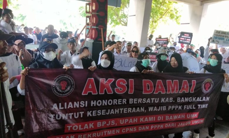 Bangkalan, Wartapos.id – Ratusan ex-THL (tenaga harian lepas) yang saat ini per januari 2025 berubah status menjadi pegawai tidak tetap dengan perjanjian kerja (PTT-TK) menggelar aksi damai di depan kantor pemerintah kabupaten (pemkab) Bangkalan dan berlanjut ke kantor DPRD kabupaten Bangkalan, senin (17/02/2025). Mereka menyatukan komando dan membentuk sebuah aliansi dengan nama aliansi honorer bersatu kabupaten Bangkalan. Lokus aksi damai tersebut adalah para pemangku kebijakan memperhatikan kesejahteraan honorer yang sudah mengabdi kepada pemerintah selama puluhan tahun.